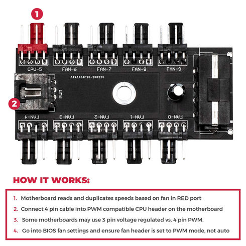 Cooling when you need it – Quiet when you don’t. The red port on our PWM fan controller allows the operating system to adjust fan speed based on temps. The PWM fan hub then matches the power level for the other ports
